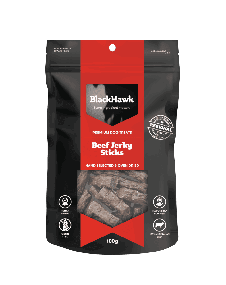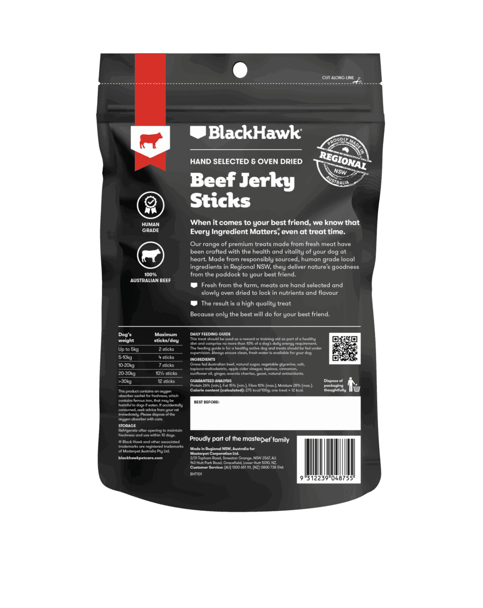Black Hawk Beef Jerky Sticks are approximately 40mm long and 8-10mm thick. The result is a high quality treat ideal for small to medium dogs over 12 months of age.
