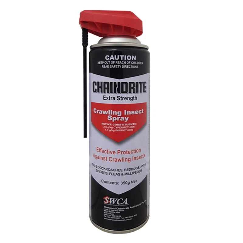 Chaindrite Extra Strength 350G Crawling Insect Spray is a powerful solution for those battling persistent crawling pests. This professional-grade aerosol insecticide offers fast-acting knockdown and long-lasting residual protection against a wide range of unwanted insects. Developed with the needs of both homeowners and pest control professionals in mind, this robust formula ensures your living spaces remain free from creepy crawlies.