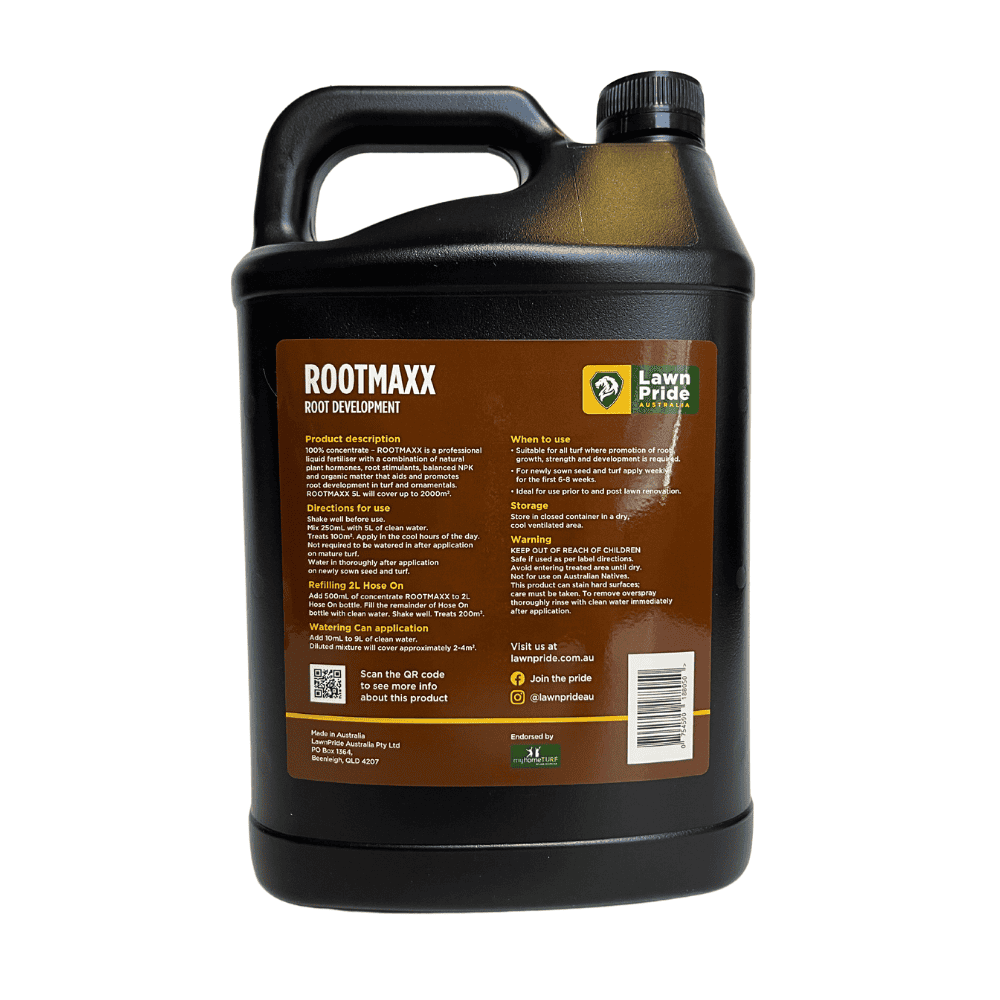 100% concentrate – A professional liquid fertiliser with a combination of natural plant hormones, root stimulants, balanced NPK and organic matter that aides and promotes root development in turf and ornamentals. Rootmaxx 5L will cover up to 2000sqm.