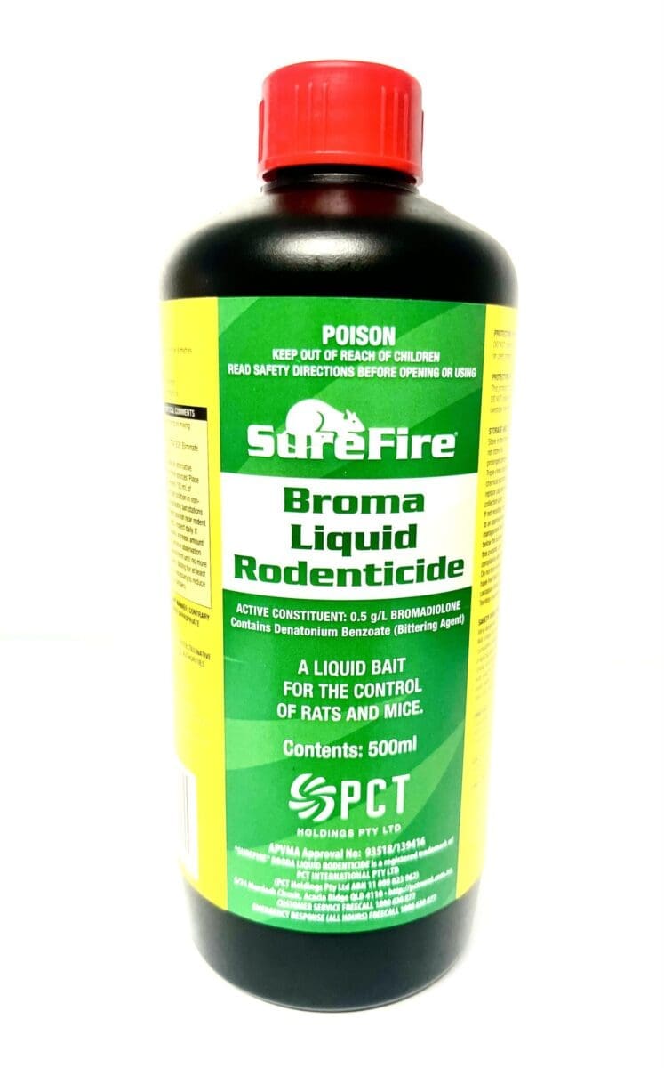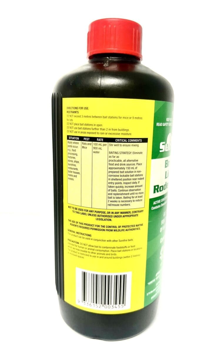 Rates are a general guide only. Before opening, carefully read Surefire Broma Liquid Rodenticide directions for use, precautionary and protection statements, storage and disposal, safety directions and first aid instructions. The product is designed for the particular purpose indicated on the label. Failure to use the product strictly as directed may be illegal and dangerous and render the product ineffective.